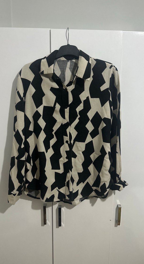 Kadın gömlek, yakalı ve uzun kollu, düğmeli ön kısmıyla dikkat çeker. Siyah ve gri zebra desenli, bol kesim ve sentetik kumaştan yapılmıştır. Günlük kullanıma uygundur.