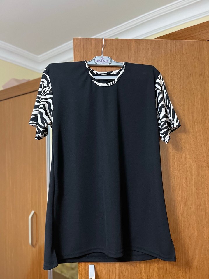 Kısa kollu, zebra desenli ve bisiklet yaka kadın tişörtü. Rahat kesimi ve normal uzunlukta, günlük sokak tarzı için uygun. Sentetik kumaştan, zahmetsiz şıklık sunar.