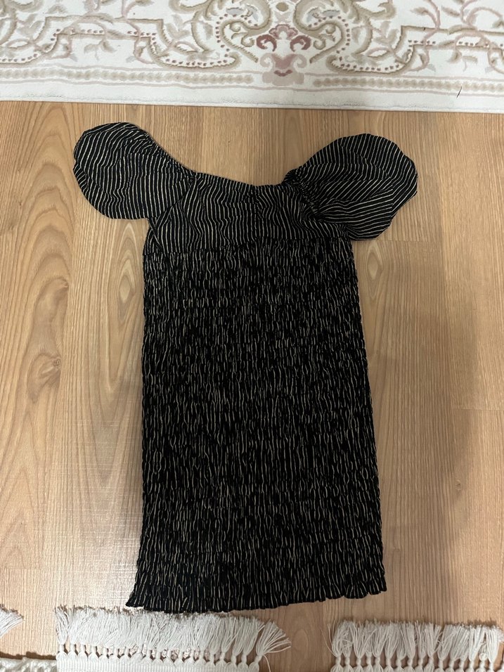 Kadınlar için balıkçı yaka ve kısa kabarık kollu, vücuda oturan triko elbise. Uzun boy, zebra desenli ve pilili dokulu siyah renkte, bohem ve avangart tarzda.