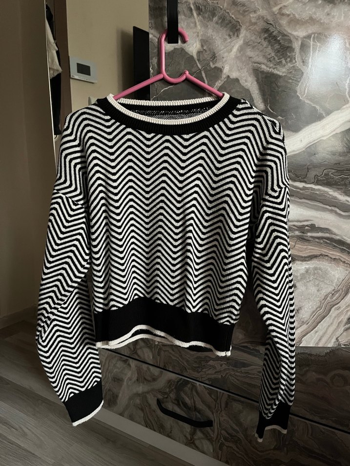Uzun kollu, crew yaka, siyah beyaz zebra desenli kadın triko sweatshirt. Rahat kesimi ve yumuşak örgü kumaşıyla günlük sokak stiline uygun, konforlu bir parça.