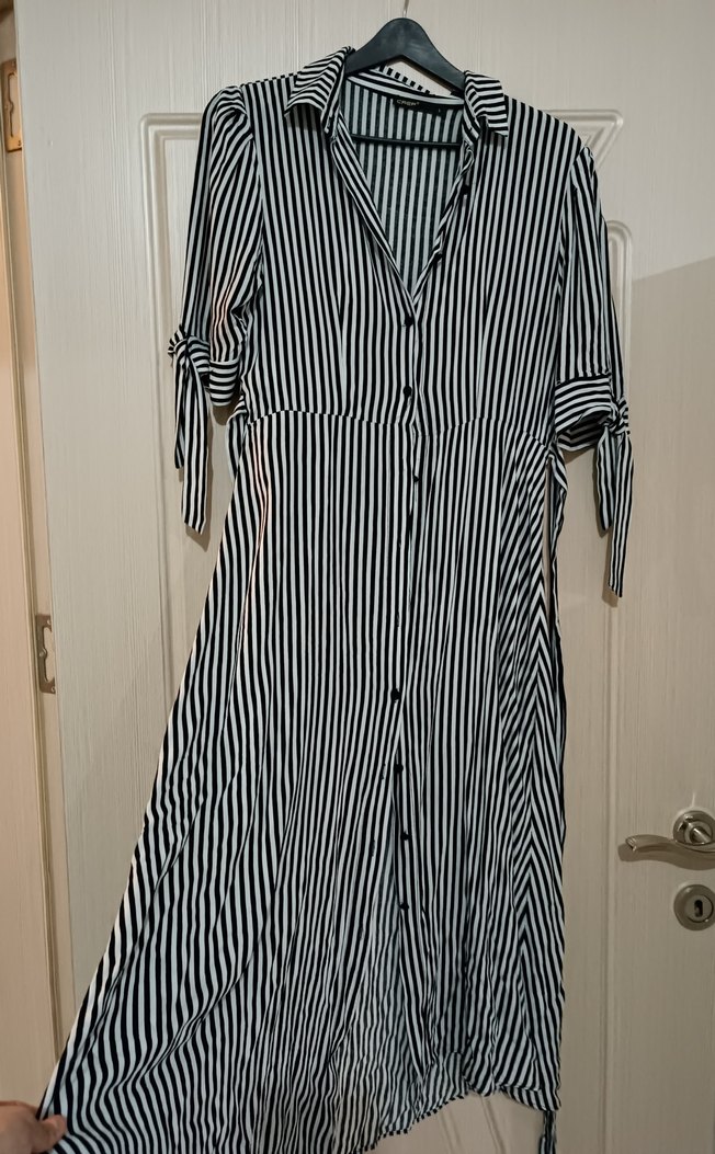 Siyah zebra desenli uzun elbise, pileli detaylı, uzun kollu ve V yakalıdır. Sentetik kumaştan üretilmiş, rahat kesim ve günlük sokak stili için uygundur. elinde Kent kumaşından bir kemeri var arkaya da dolabileceğiniz bir ya da iki kez giydim 168 boy 55 58 kilo arasında
