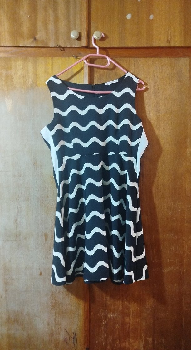 Kolsuz, tekne yaka midi elbise, bel kısmı oturan ve pileli zebra desenli. Günlük kullanım için yumuşak sentetik kumaştan yapılmıştır.