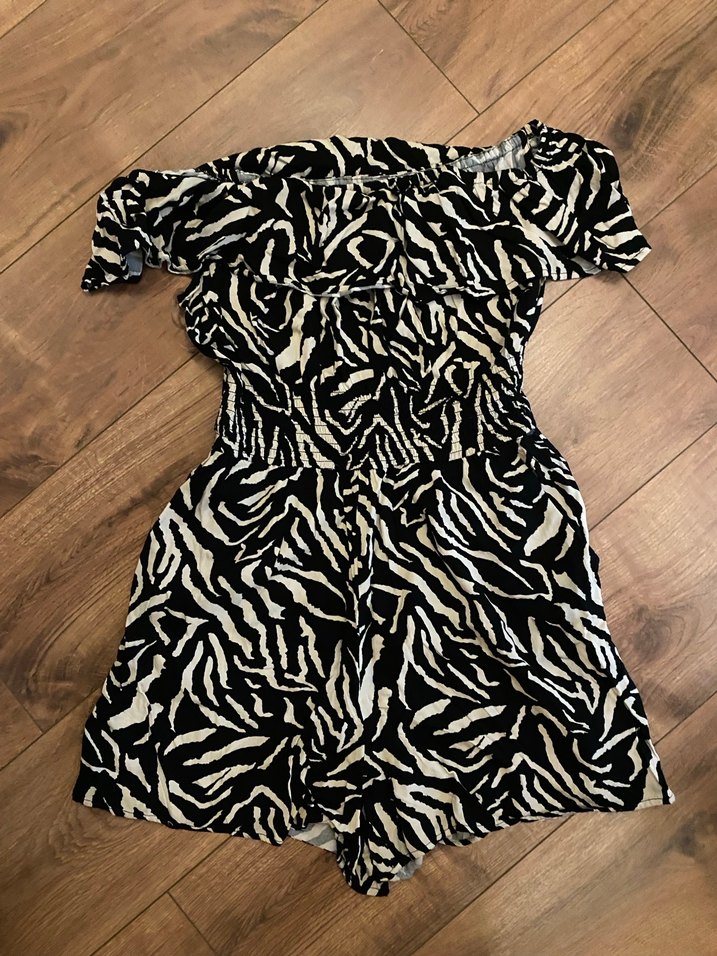 Siyah zebra desenli mini tulum, tekne yaka, kısa kollu ve fırfır detaylıdır. Sentetik kumaştan, bol kesim ve bohem tarzındadır.