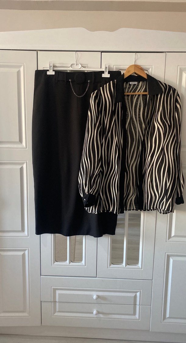 Kadınlar için ofis giyimi seti, kesik yakalı zebra desenli uzun kollu ipek görünümlü gömlek ve pilili siyah midi etekten oluşur, çağdaş iş stiline uygundur Etek boy 95 cm . Bel ölçüsü 49 50 tamamı 150 basen 57 astarlı kapalı yırtmaçlı gömlek şifon on 74  iki koltuk 6:57