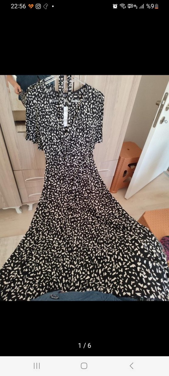 Zebra desenli, kısa kollu, V yakalı, piliseli detaylı uzun ve bol kesim siyah elbise. etiketi kopardım