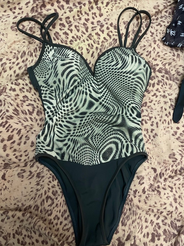 Zebra desenli, çift askılı ve dantel detaylı, vücuda oturan kadın mayo. Midi boyunda, koyu renklerde, şık plaj kombinleri için uygun.