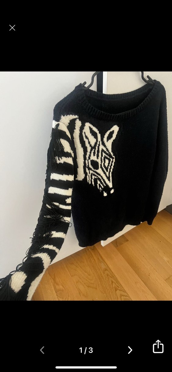 Siyah renkli, uzun kollu ve salaş kesim triko kazak, tek kollu zebra desen detaylarıyla günlük rahat ve gotik tarz sunar.