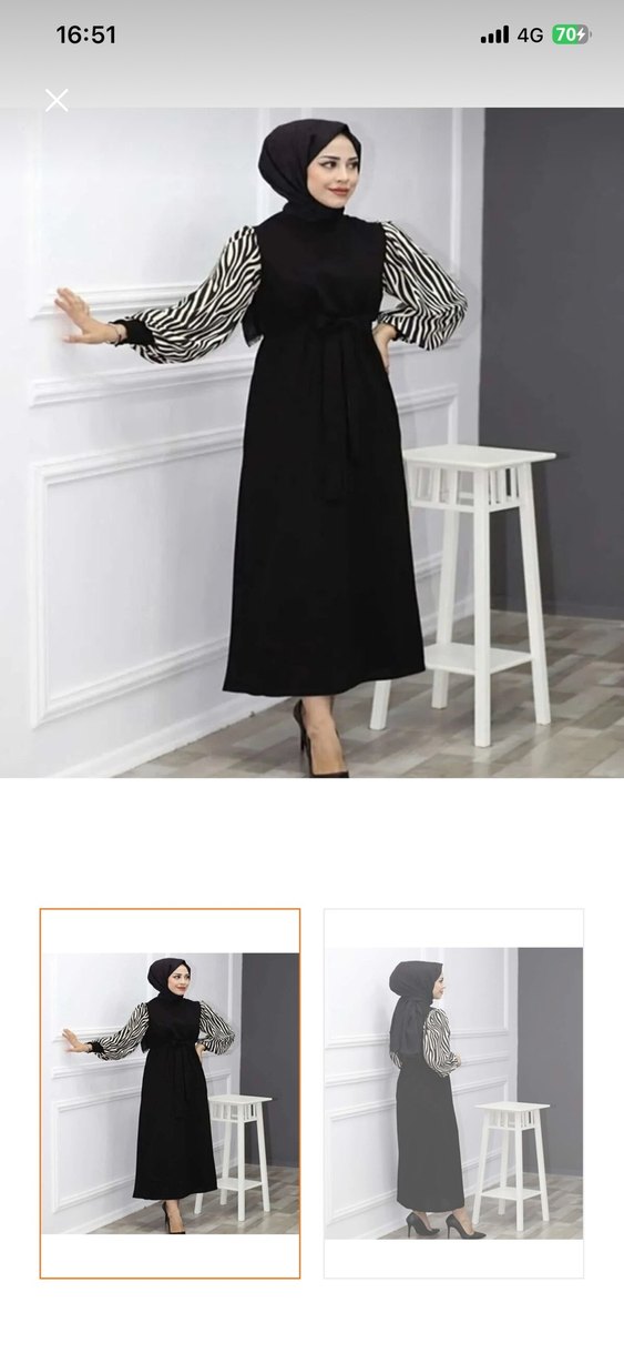 Yüksek yakalı, zebra desenli drapeli kolları olan siyah uzun elbise. Ofis için uygun, modest ve çağdaş bir görünüme sahiptir.
