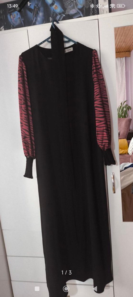 Siyah uzun elbise, bol kesim ve drapeli tasarımın yanı sıra zebra desenli uzun kollara sahip, yüksek yakalı ve mütevazı gotik tarzda günlük kullanıma uygundur.