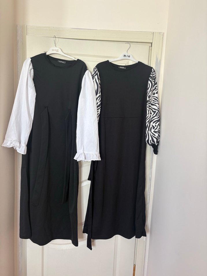Siyah uzun elbise, zebra desenli uzun kollara ve yuvarlak yaka sahiptir. Bol kesim ve kemerli, sentetik kumaştan günlük kullanıma uygundur.