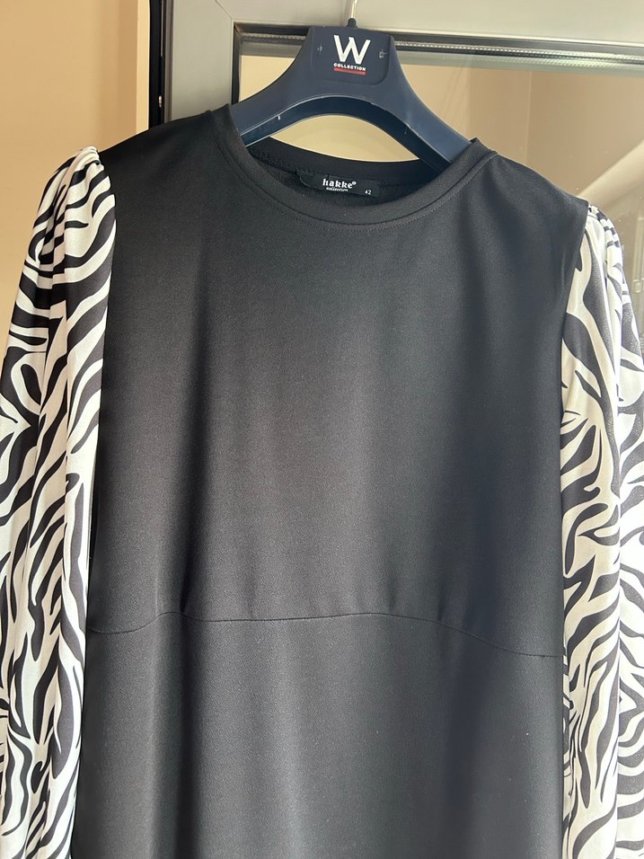 Siyah uzun kollu elbise, zebra desenli kollar ve yuvarlak yaka ile. Sentetik kumaştan, bol kesim ve drapeli tasarım, günlük sokak giyimi için uygun.