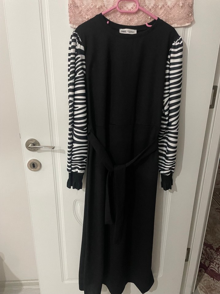 Uzun siyah elbise, uzun zebra desenli kollara ve yüksek yakaya sahiptir. Sentetik kumaştan, pile detaylı ve rahat kesimlidir. Günlük kullanıma uygun modesti goth tarzda.
