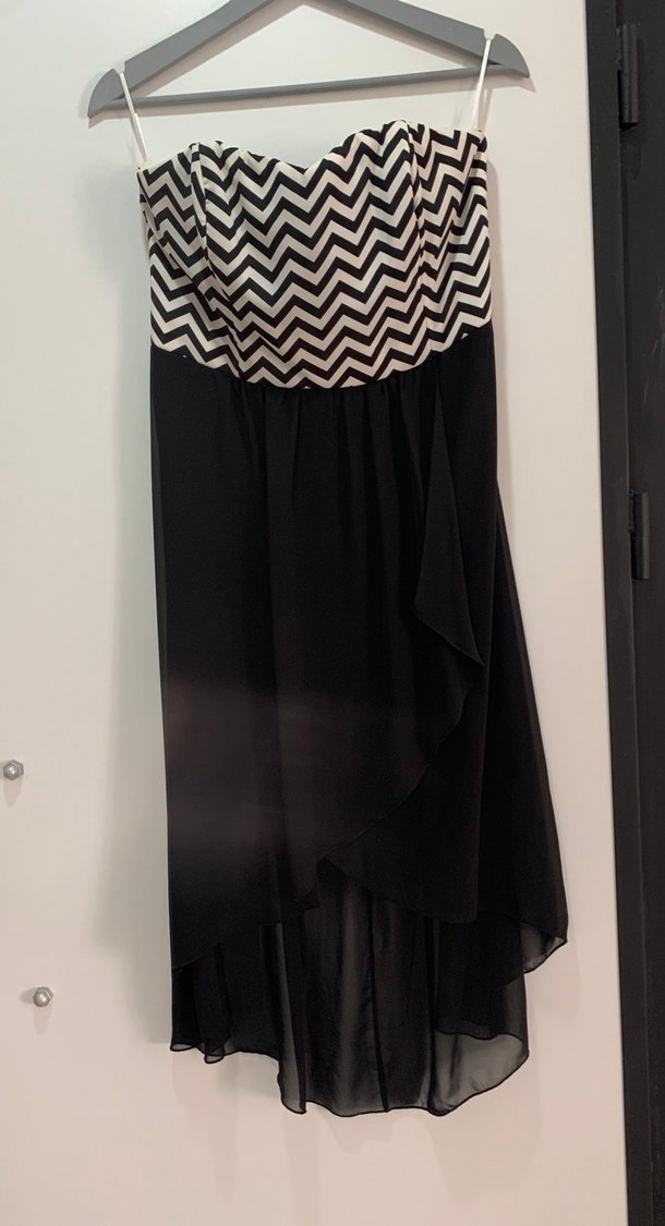 Zebra desenli pileli üst kısmı ve siyah uzun etekli, straplez ve vücuda oturan abiye elbisedir.