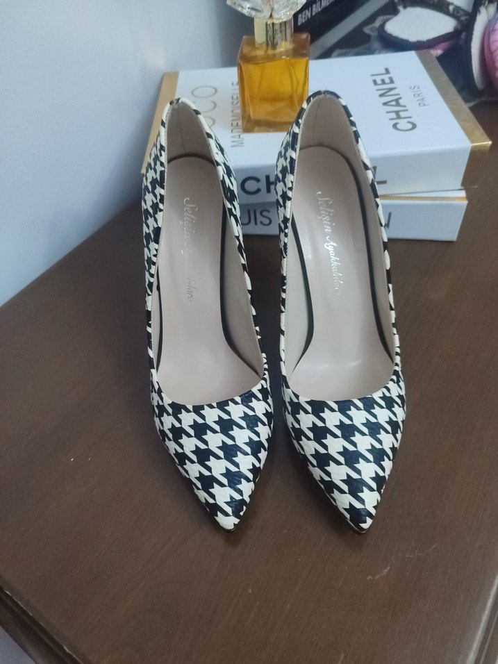 Zebra desenli ve pileli tasarıma sahip, dayanıklı kauçuk malzemeden yapılmış kadın stiletto ayakkabılar. Modern tarzda olup ofis kullanımı için uygundur.