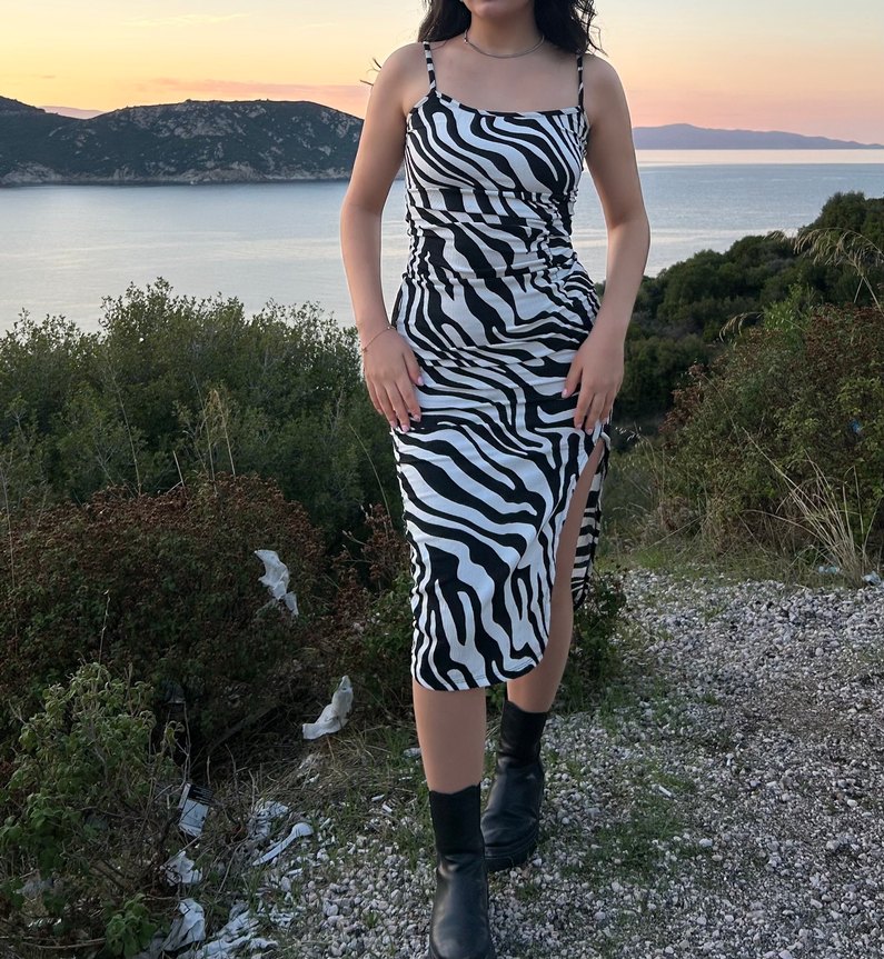 Askılı, zebra desenli ve drapeli uzun elbise
