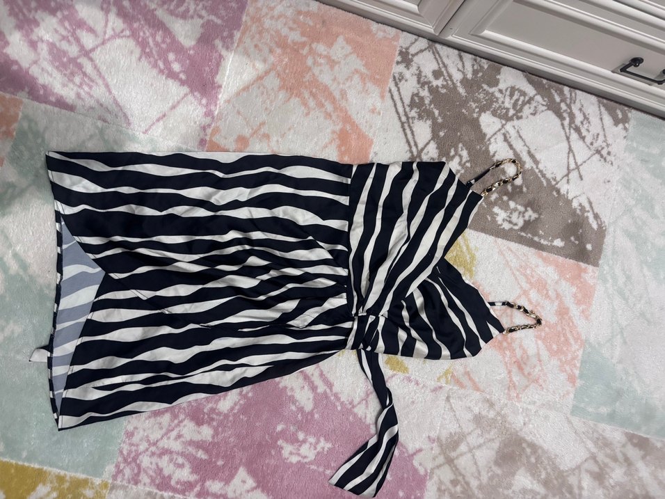 Zebra desenli, askılı ve uzun kesim elbise. V yaka, fırfır detayları ve bağlamalı bel ile bohem tarzı, parti için uygun.