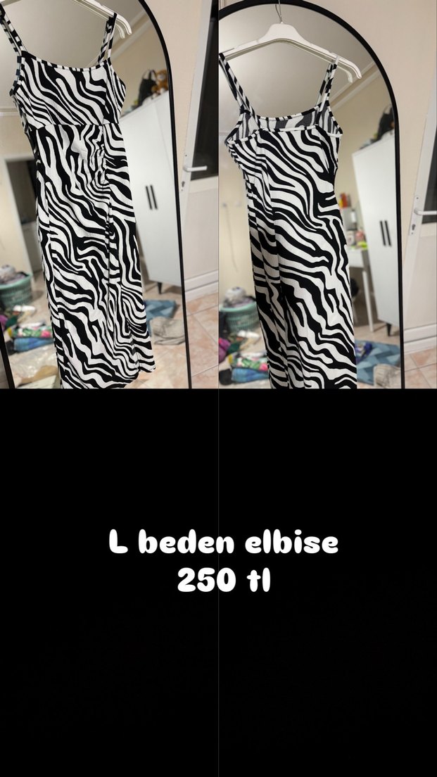 Zebra desenli, pileli ve uzun askılı bu elbise, sentetik kumaştan üretilmiş olup, tekne yaka ve fitted kesime sahiptir. L beden, 250 TL.