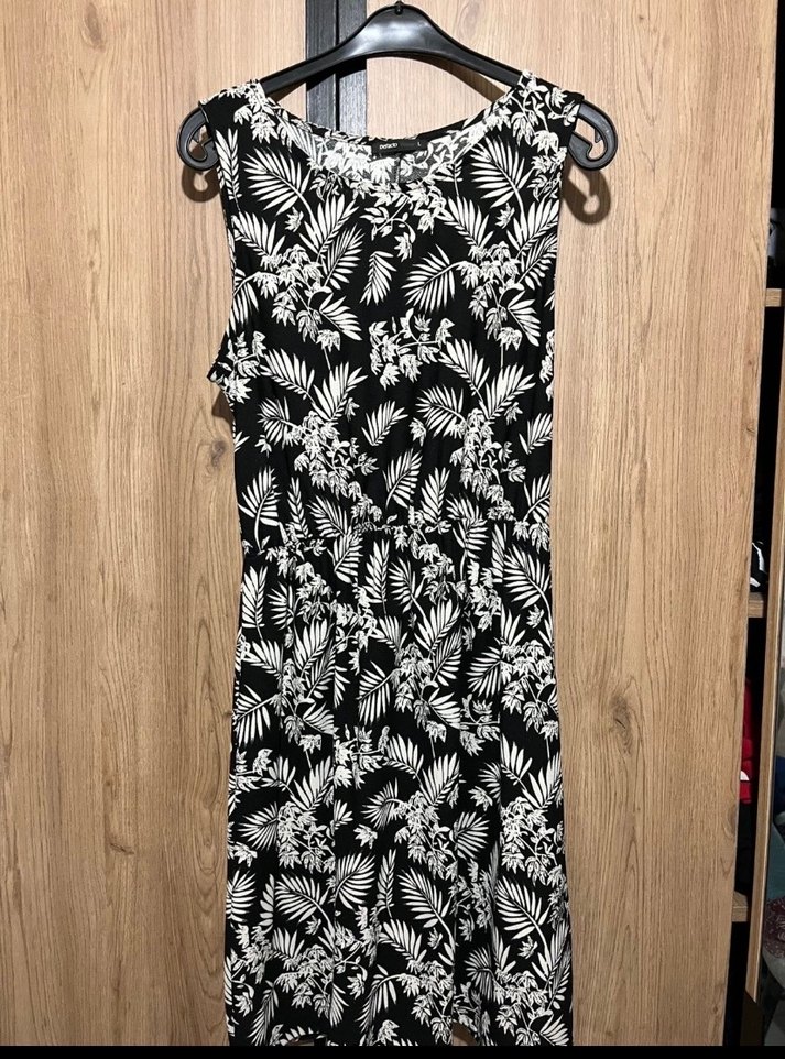 Kolsuz, uzun siyah elbise yüksek yakalı ve pileli detaylıdır. Zebra desenli, sentetik kumaştan, rahat kesim günlük kullanım için uygundur.