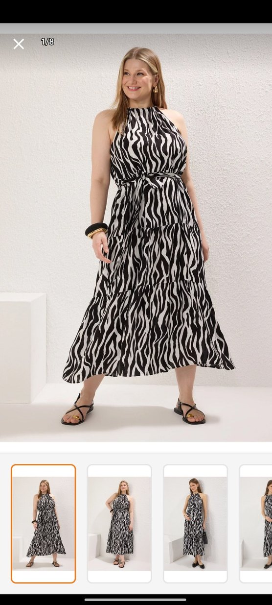 Siyah ve açık renk zebra desenli uzun elbise, yüksek yakalı ve askılıdır. Gevşek kesim, pileli detaylara sahip, sentetik kumaştan üretilmiştir, açık hava kullanımı için uygundur.