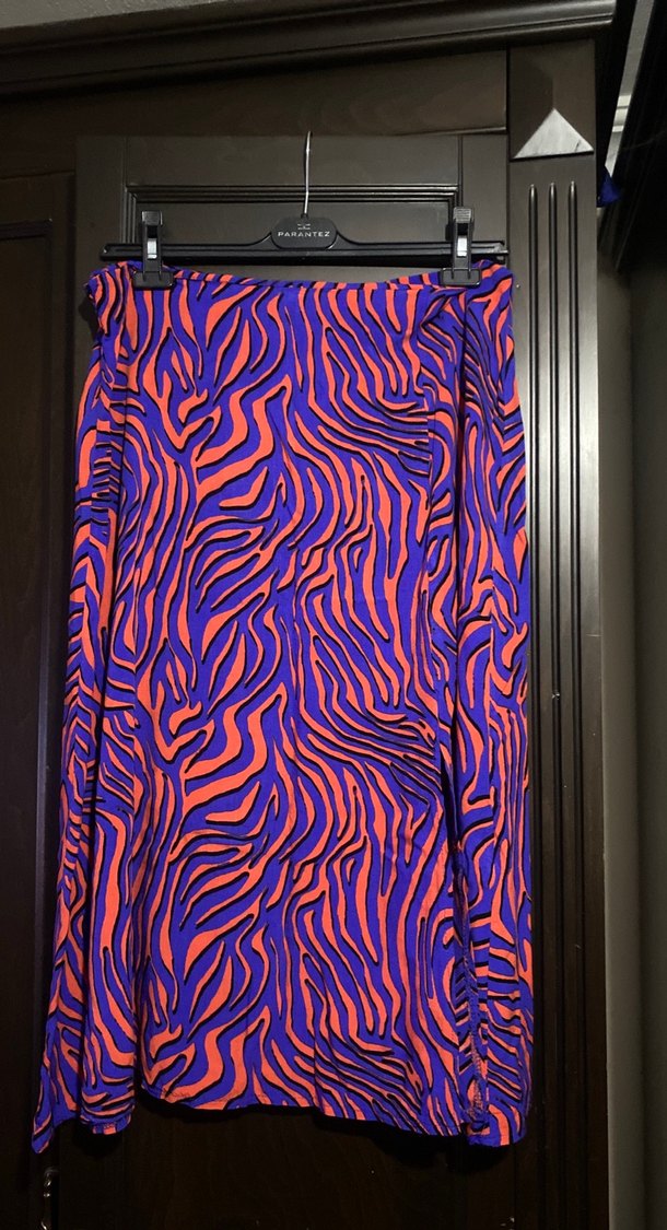 Bu dar kesim uzun etek, canlı zebra desenli ve drapeli tasarıma sahip, yumuşak sentetik kumaştan üretilmiştir. Günlük kullanım için pop kültür ve avangard tarzda uygundur.