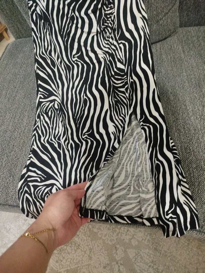 sentetik kumaştan zebra desenli uzun, vücuda oturan midi elbise Günlük kullanıma uygun modern tarzdadır