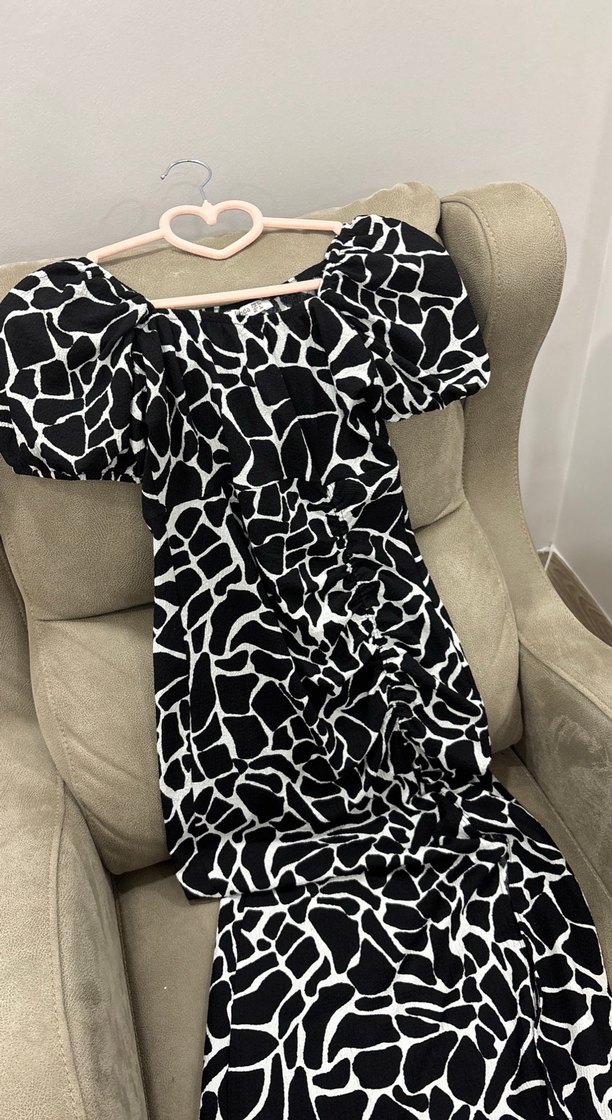Zebra desenli, kayık yakalı ve kısa kollu, sentetik kumaştan yapılmış, vücuda oturan uzun elbise. Günlük kullanım için drapeli ve çağdaş bir tasarıma sahip.