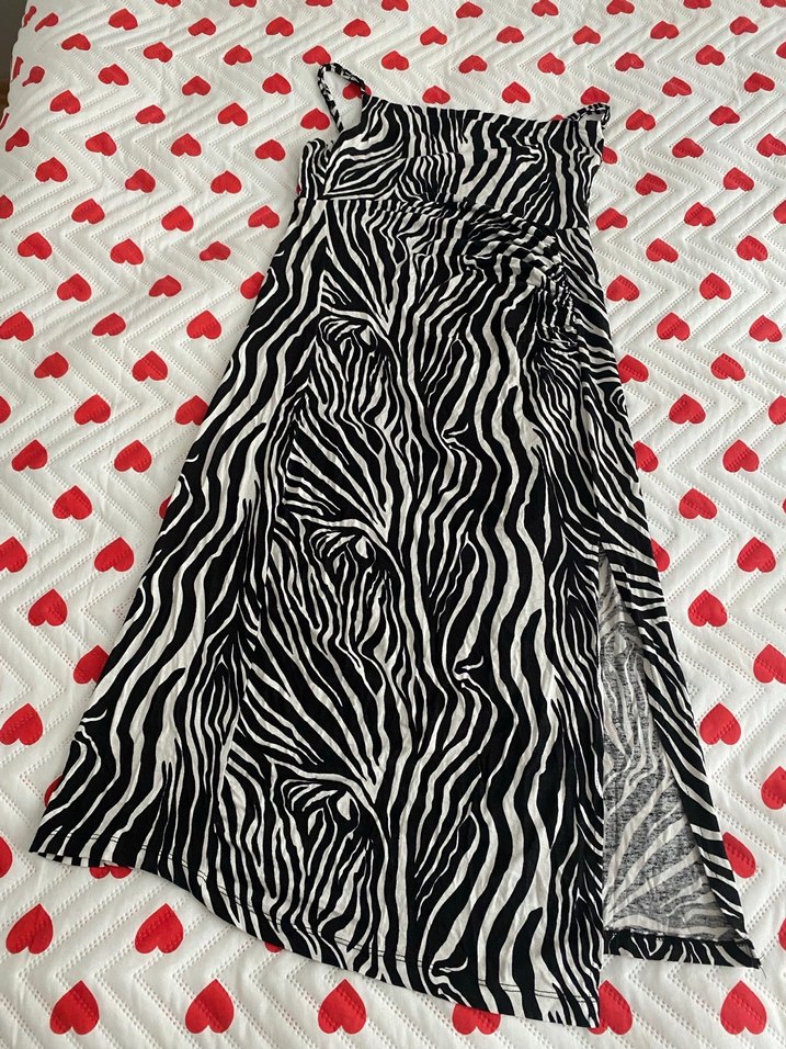 Sentetik kumaştan yapılmış, zebra desenli ve fırfırlı, uzun ve vücuda oturan. Bohem tarzda, romantik akşamlar için uygun.