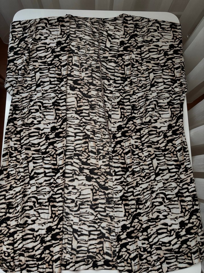 Zebra desenli uzun hamile tunik, pileli detaylı ve kayık yaka ile tasarlanmıştır. Askılı kollu, bol kesim ve koyu kahverengi sentetik kumaştandır. Günlük kullanıma uygundur.