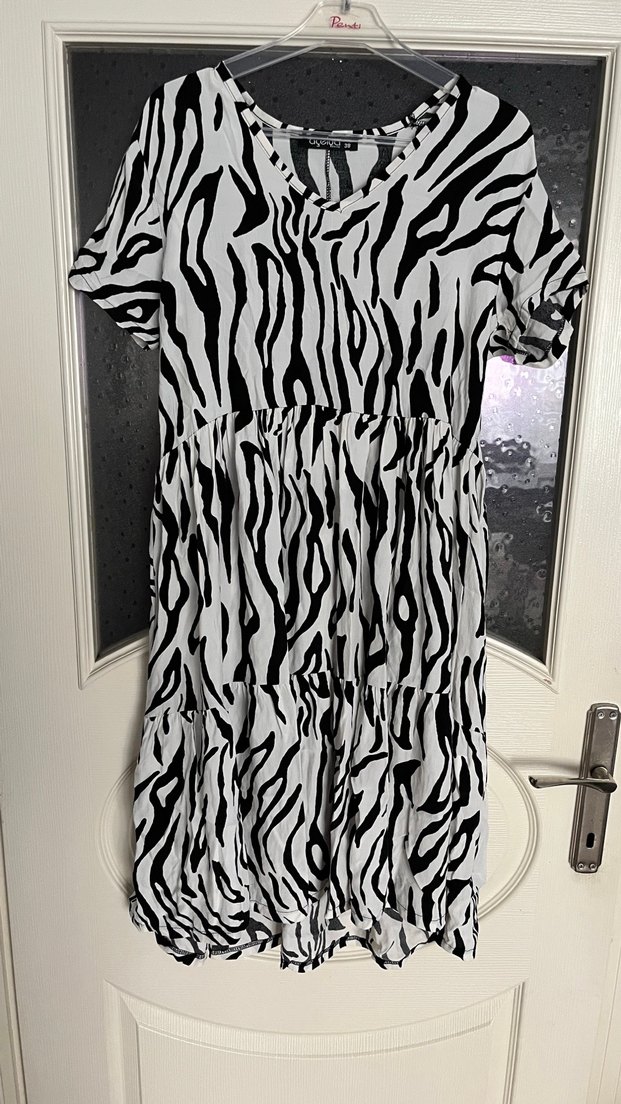 Zebra desenli, kısa kollu, salaş kesim ve fırfırlı uzun kadın elbisesi. Sentetik kumaştan, bohem ve retro tarzda, dış mekan kullanımı için uygun.