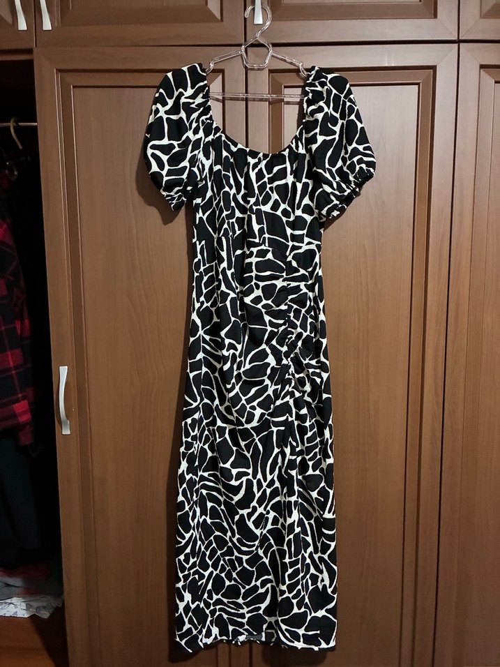 Bu fitted uzun elbise, zebra desenli, tekne yakalı ve drapeli detaylara sahip. Askılı kolları ve modern minimalist tarzı ile siyah sentetik kumaştan yapılmıştır. (1 kez giydim kilo aldığım için satıyorum tertemiz trendyoldan alındı. XL beden esnek kumaş )