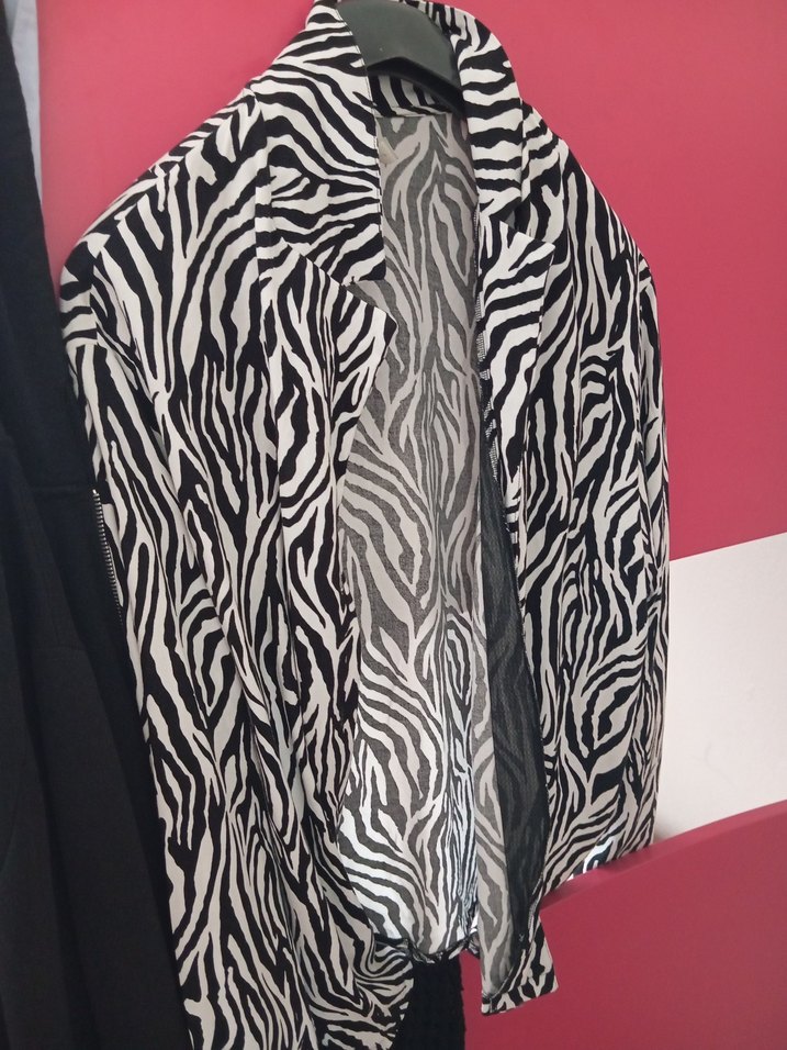 Sentetik kumaştan, pileli zebra desenli, uzun ve ince kesim kadın ceketi, kesik yaka detaylıdır.