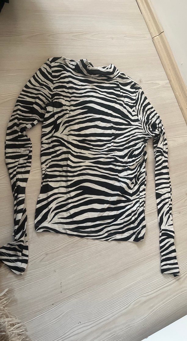 Zebra desenli, uzun kollu ve balıkçı yakalı kadın bluzudur. Sentetik kumaştan yapılmış, pile detaylı ve midi normal boydadır. Günlük ve sokak stiline uygundur.