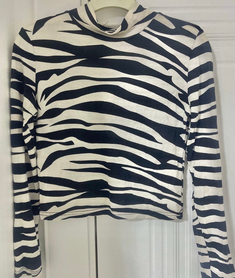 Zebra desenli, uzun kollu ve balıkçı yakalı, normal midi boyda, pileli sentetik kumaştan yapılmış dar kesim bluz.