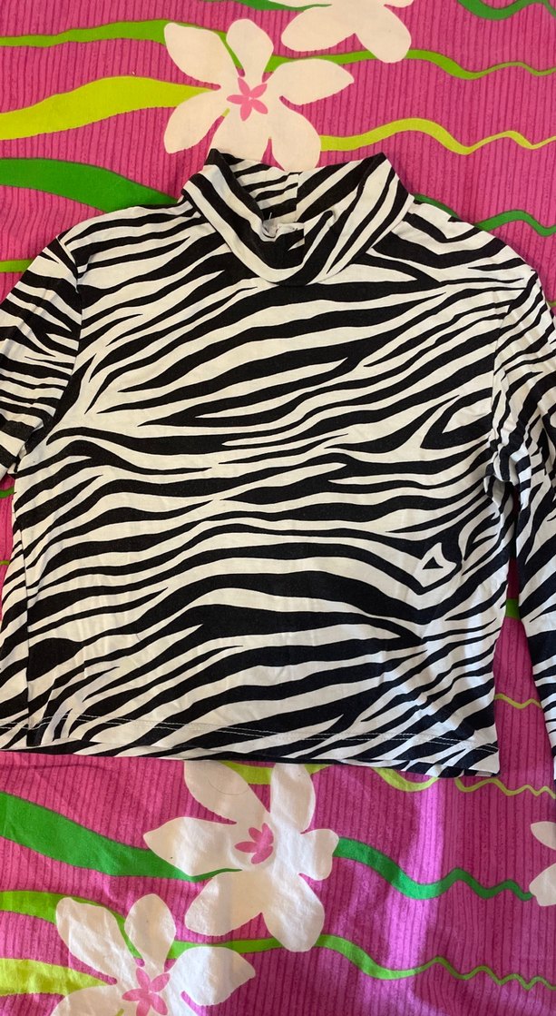 Uzun kollu, balıkçı yaka, zebra desenli ve fırfır detaylı dar kesim bluz, sokak modası ve partiler için uygundur. Bi kere giyildi