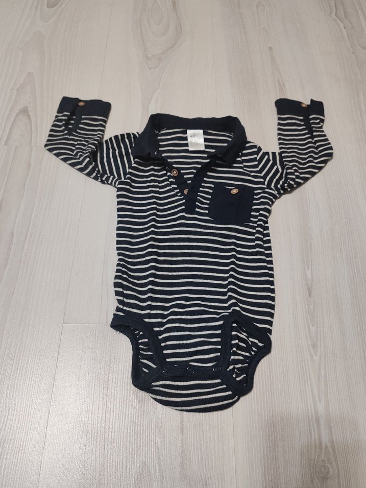 Koyu gri renkli, uzun kollu ve yakalı bebek body. Yumuşak, sıcak kumaştan, düğmeli ve zebra desenlidir.