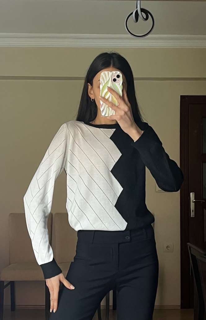 Bu kadın kazak, bisiklet yaka ve uzun kolludur. Zebra desenli koyu beyaz renkte, regular fit ve yumuşak sentetik örgü kumaştandır. Ofis ve günlük kullanıma uygundur.