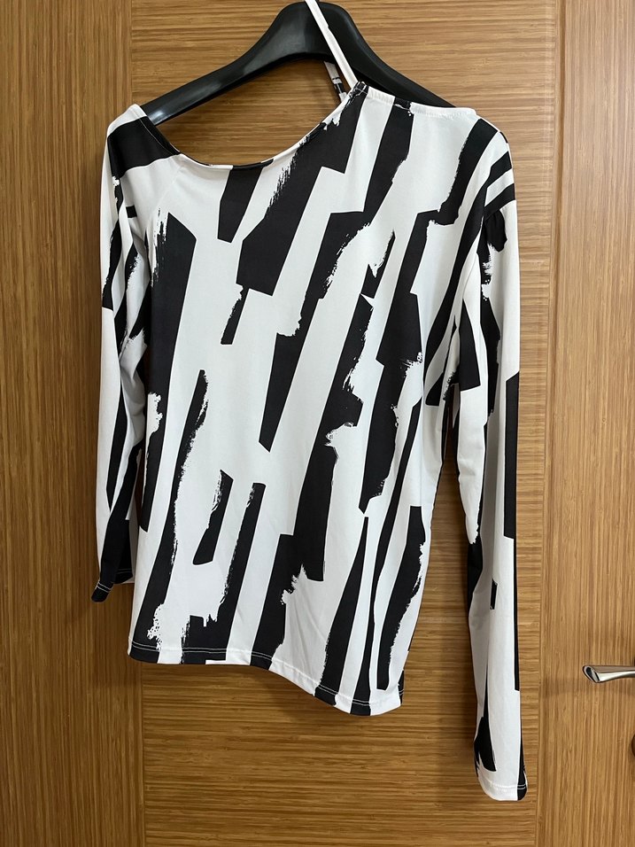 Bu bluz, bol kesim ve kayık yaka ile uzun kolludur. Koyu beyaz tonlarda zebra deseni ve pile detayları vardır, sentetik kumaştan yapılmıştır. Midi boyu günlük kullanıma uygundur.