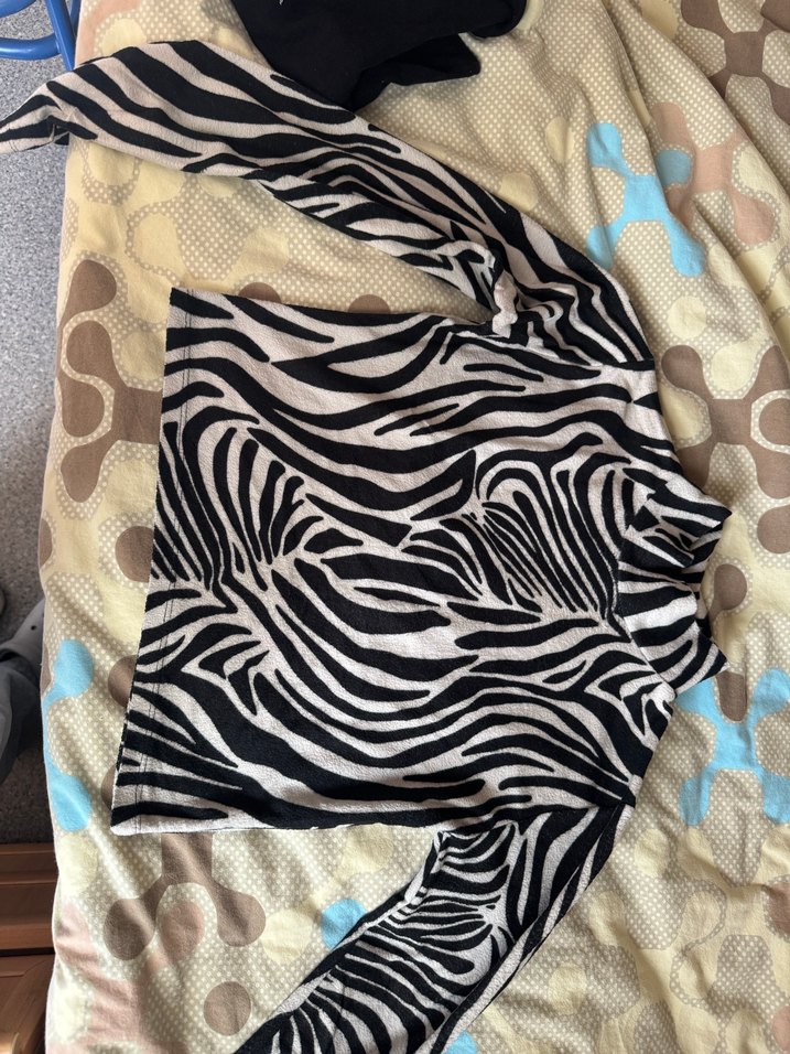 zebra desenli, boğazlı ve uzun kollu sentetik kumaştan yapılmış, kürk detaylı, günlük kullanıma uygun bohem tarzda fitted bluz. Kumaşı yumusacık kürk ,süet gibi . bir kaç kez giyildi