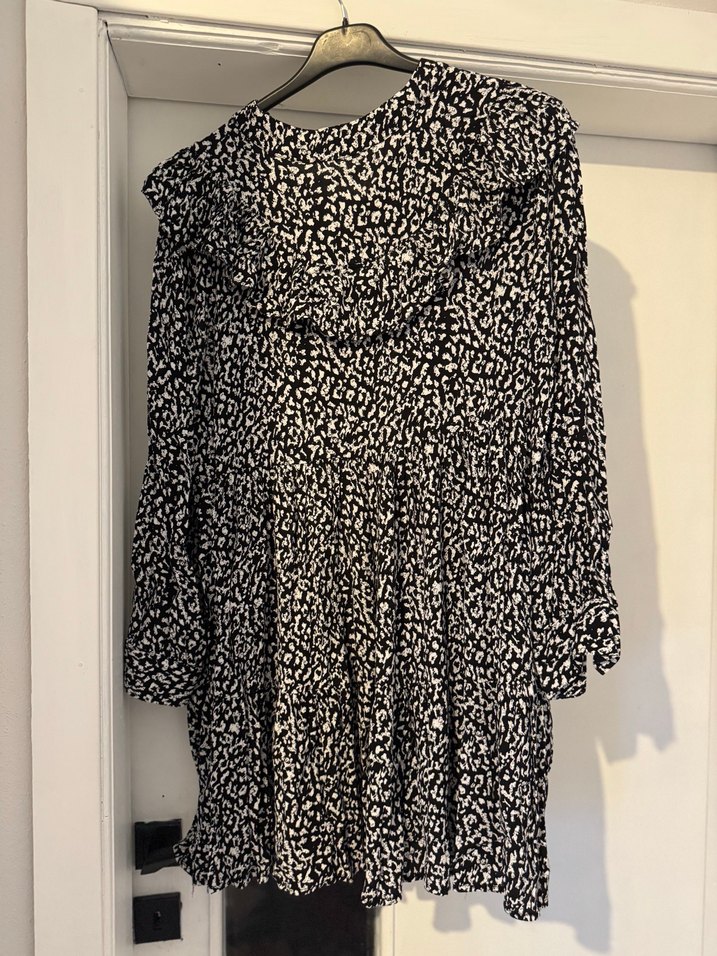 Uzun kollu, v yaka ve fırfırlı detaylara sahip bol kesim hamile bluzu. Günlük kullanım için uygun, çağdaş zebra desenli ve koyu tonlarda. Yumuşak penye kumaştan üretilmiştir.