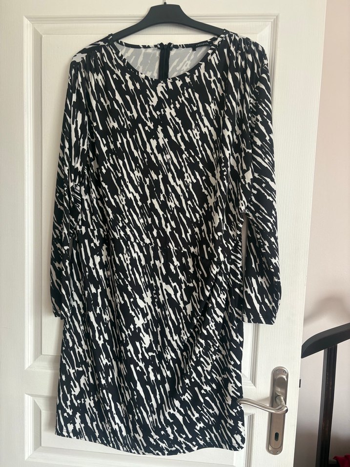 Zebra desenli, drapeli, uzun kollu elbise. Siyah ve gri renklerde, tekne yakalı, bol ve uzun kesim, sentetik kumaştan günlük kullanım için.