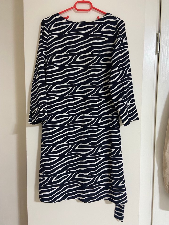 Uzun kollu, zebra desenli ve pilili elbise Tekne yaka ve bol kesim olup, sentetik kumaştan üretilmiştir. Günlük kullanıma uygun minimal ve çağdaş tarzda.