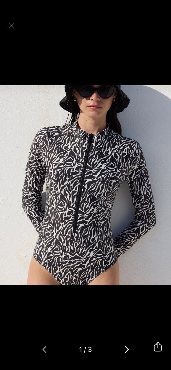 Siyah zebra desenli, uzun kollu ve fermuarlı bu mini mayo, athleisure tarzıyla günlük kullanıma uygun şık bir seçimdir.