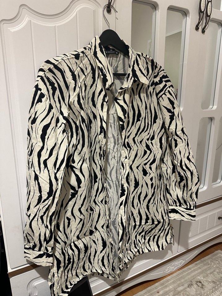 Gri beyaz zebra desenli, keten kumaştan, uzun kollu ve düğmeli, yakalı, bol kesim uzun gömlek. Sokak stili ve günlük kullanım için uygundur.