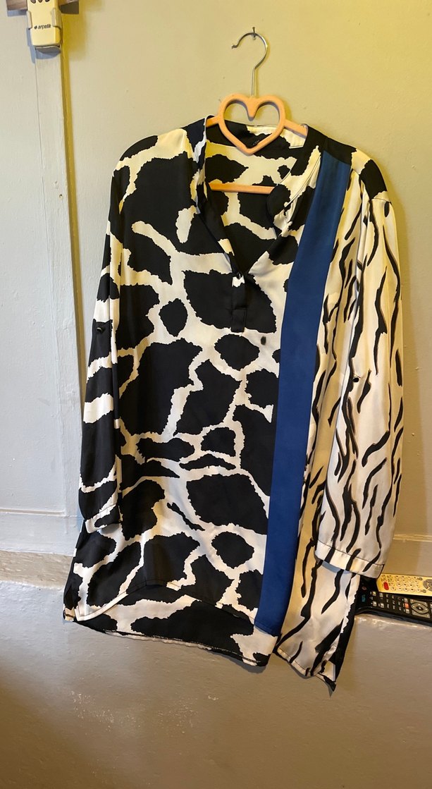 Sentetik kumaştan, zebra desenli ve mavi drapeli şeritli, yakalı, uzun kollu, bol kesim gömlek. Sokak modasına uygun.