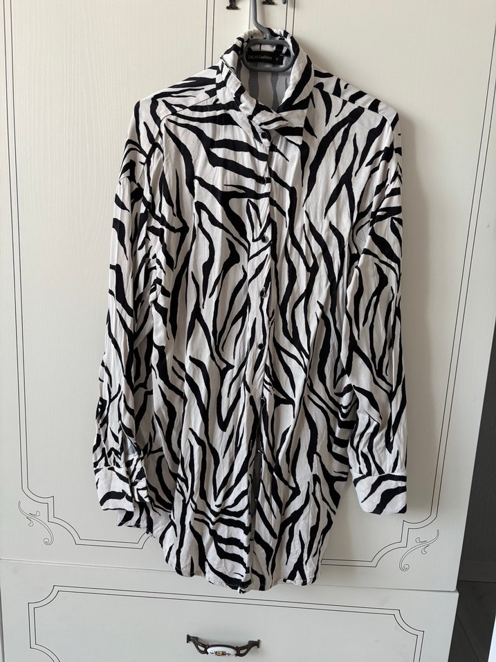 bol kesim ve pile detaylı, yakalı, zebra desenli kadın gömleği. Kusurlarını fotografladım. Beden s yaziyor ama geniş kesim olduğu için m bedende tercih edebilir ben m bedenim giydim salaş duruyordu