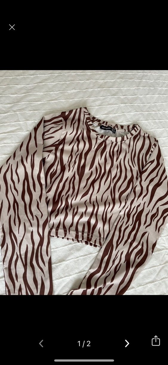 Zebra desenli, uzun kollu ve tekne yakalı kadın bluz. Sentetik kumaştan, pile detaylı ve günlük sokak stili için uygun.