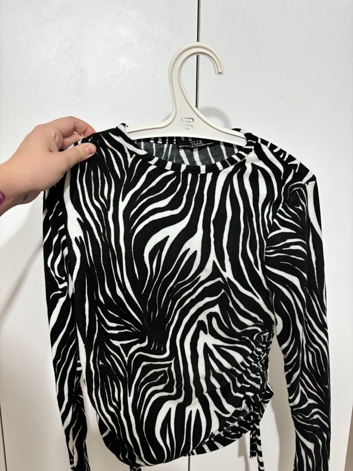 Zebra desenli, uzun kollu ve bisiklet yaka kadın bluz. Sentetik kumaştan, pile detaylı ve midi boyda, günlük sokak stiline uygun minimal bir tasarım.