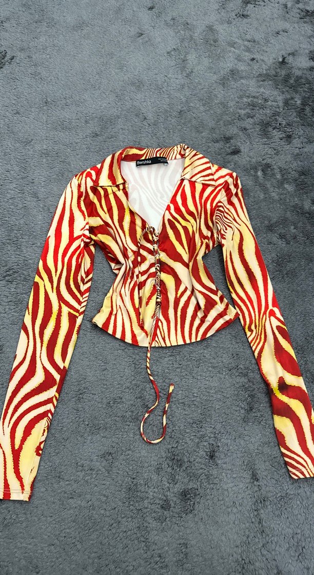 Parlak çok renkli zebra desenli, yakalı ve düğmeli uzun kollu, vücuda oturan kadın bluz. Sentetik kumaştan, bohem ve retro tarzda, sokak modasına uygun.