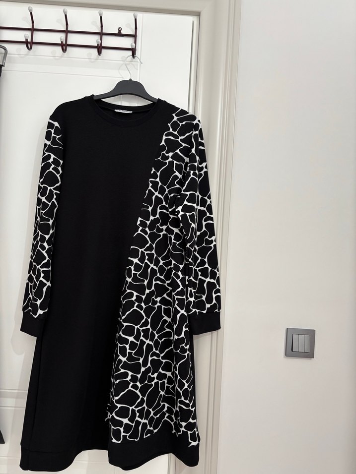 Uzun boy, bol kesim kadın elbise, zebra desenli arkası düz renk. Hiç giyilmedi kumaşı tertemiz. Markası Sitare