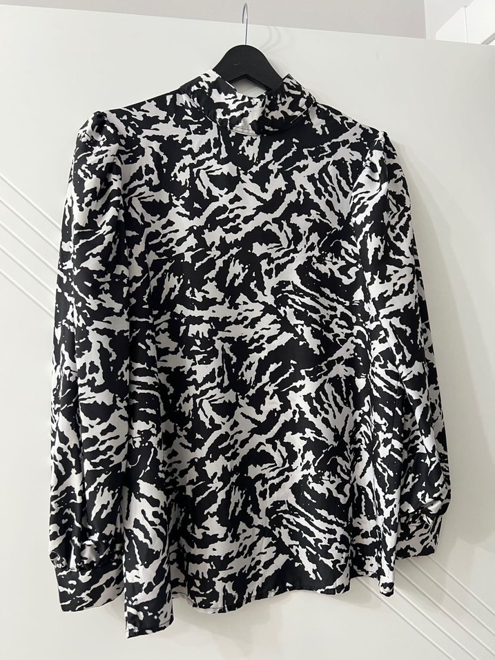 Zebra desenli, uzun kollu, yüksek yakalı kadın gömlek. Düğmeli, bol kesim ve midi boyda, siyah ve gri tonlarda sentetik kumaştan. Sokak stiline uygun, dış mekan için ideal.